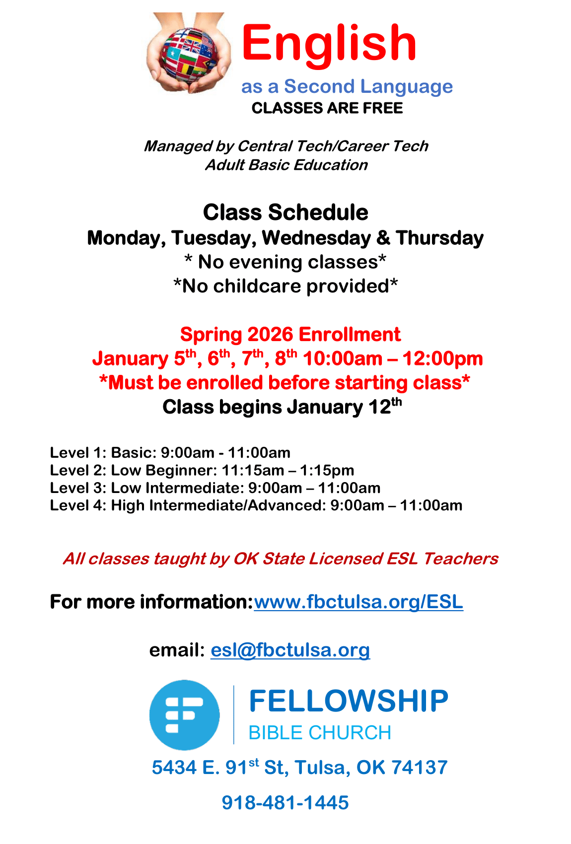 Join FBC in supporting our ESL ministry and take part in Fellowship International, our new conversational ministry within Tulsa. Second and fourth Thursday from 5:30pm-7:00pm in the Student Center we will host conversations with students from the international community in Tulsa. Sign up below to have a conversation with an ESL student and begin a new relationship!